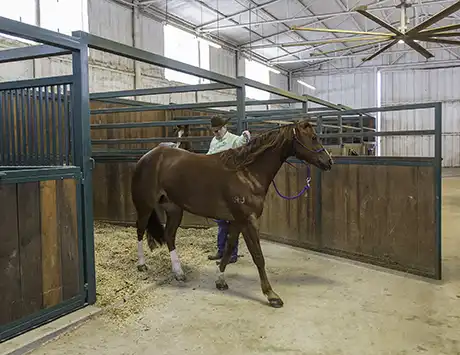 While you want the horse to calmly walk into and out of the stall, don’t be surprised if he initially trots through it. Don’t try to stop him from trotting, because that will only make him more nervous. Just keep sending him in and out of the stall until he relaxes on his own and walks.